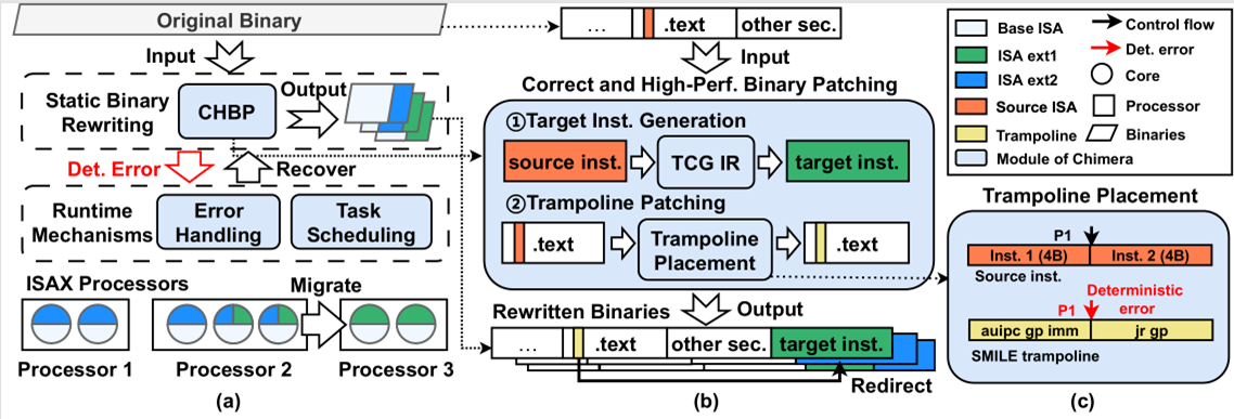 针对上述问题,研究团队设计了基于软硬件协同设计的RISC-V异构计算系统Chimera。该系统基于二进制重写方法,利用RISC-V指令集的编码特性,使可能出现的运行错误具备确定性与可恢复性,并借助轻量级机制实现安全恢复。新系统相比现有基于二进制重写方法设计的系统,错误恢复机制的触发频率整体降低了4个数量级,在无需源代码的情况下,实现了异构RISC-V处理器核心间高效、透明且正确性有保障的任务迁移与调度。