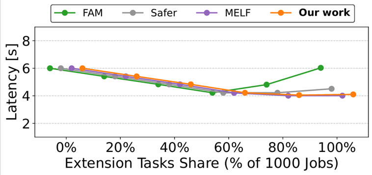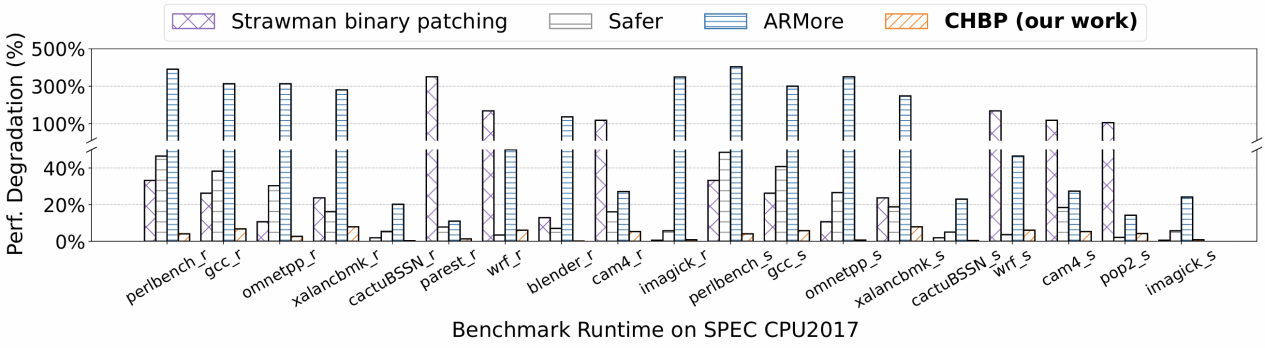 在性能评估中,团队将Chimera与多种现有异构计算系统进行了对比实验,包括基于原生编译的MELF、基于二进制重写的Safer以及基于运行时调度的FAM(Fault And Migration)。实验表明,在ISAX异构的硬件环境中,Chimera较Safer(不保证正确性)和FAM(不支持透明迁移)分别实现了12.5%和33.1%的性能提升。而相较依赖源码的MELF,Safer和FAM的性能开销为17.9%和55.4%,而Chimera的性能开销仅为3.2%。此外,基于SPEC CPU 2017基准测试的进一步对比显示,Chimera重写后的二进制文件性能优于现有二进制重写方法,最高性能提升达42.5%。