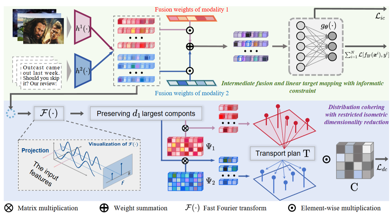 基于上述跨融合框架的理论推导,研究团队提出了一种新型的多模态表示学习方法Intermediate Fusion with Informatic Constraint and Distribution Coherence(IID)。该方法基于中层融合框架,包含信息约束模块和分布一致性模块两部分,分别用于实现跨融合框架理论推导中的特定约束条件并缓解模态间的分布不一致问题。